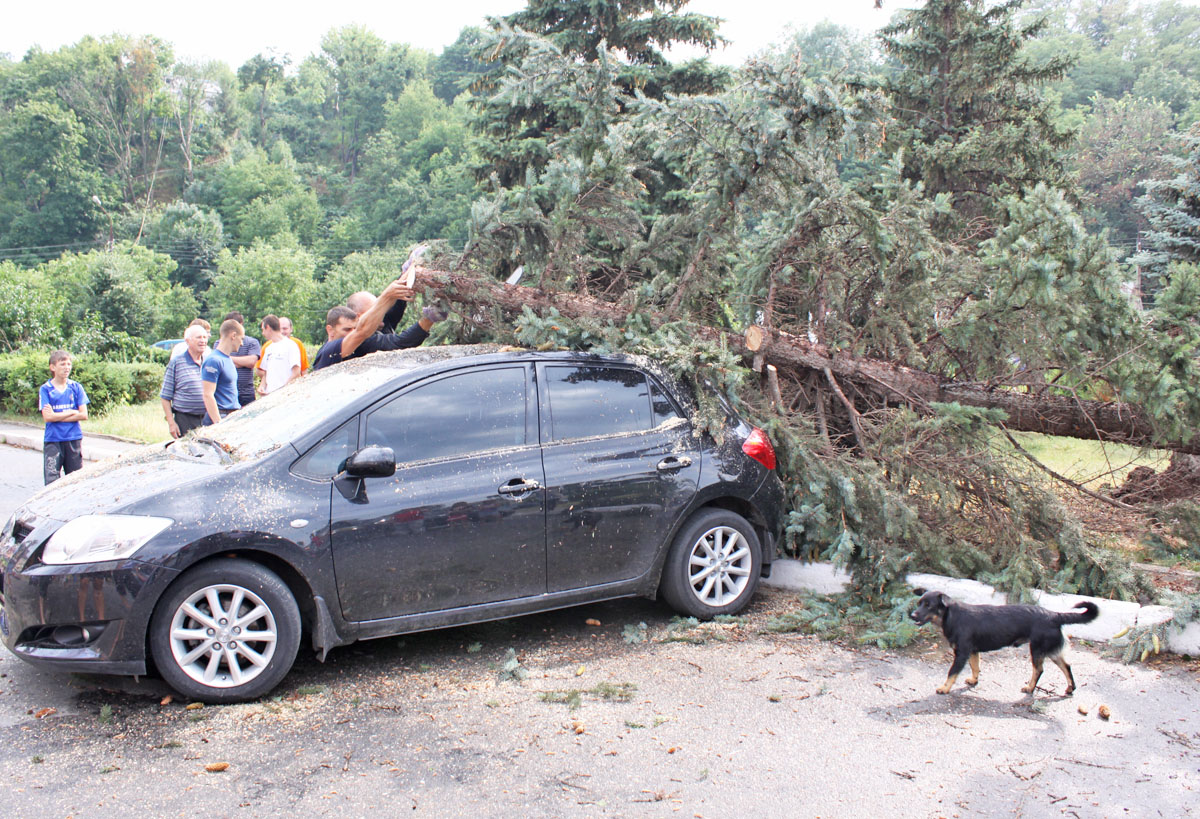 Тойоту Ярис на площі Т.Шевченка (колишня ім. Комсомолу) під час буревію привалило блакитною ялинкою (на диво, авто майже не постраждало)))