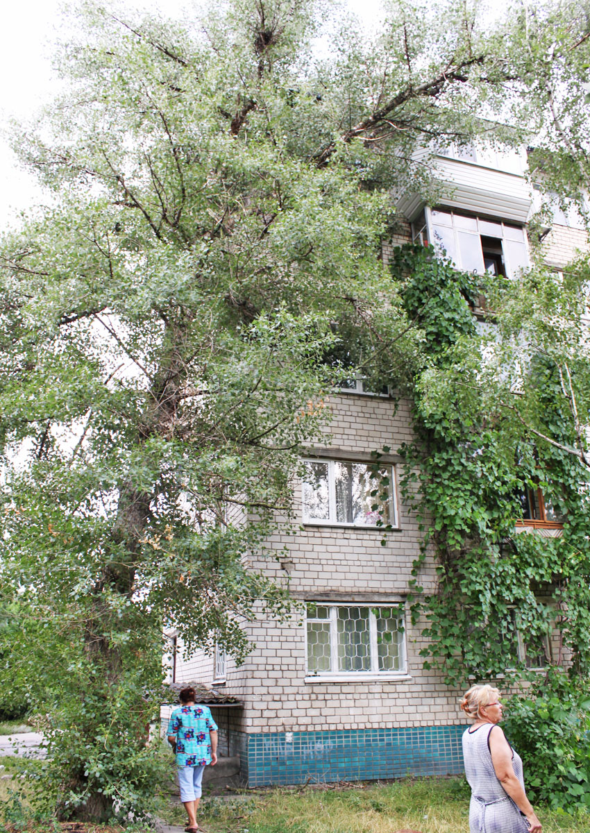 Це дерево «сперлося» на ріг п’ятиповерхівки по вул. Шевченка. Небезпечне сусідство